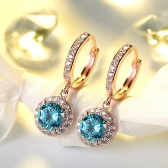 Cercei cu design luxury deosebit, placati cu pietre semipretioase Zirconiu culoare Aquamarine si Aur galben 18k.
