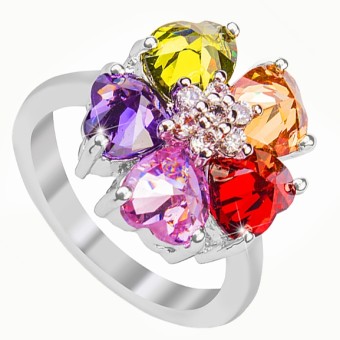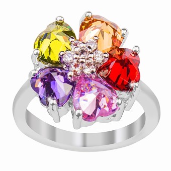 Inel elegant tip glamour, cu un design floral deosebit de apreciat, placat cu aur alb de 18k, pietre Cubic Zirconia (multicolore) si cristale stralucitoare.