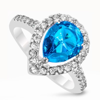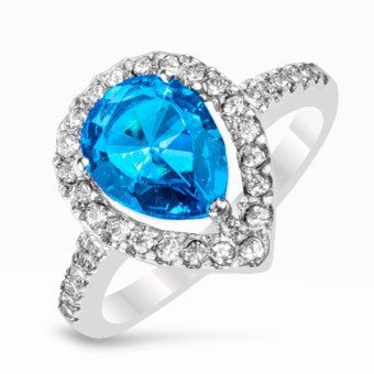 Inel glamour tip fashion, placat cu aur alb de 10k, piatra semipretioasa Acvamarin (creata in laborator) si cristale stralucitoare.