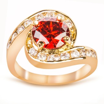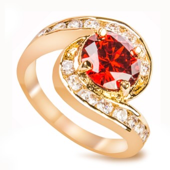 Inel fashion deosebit, placat cu aur galben 14k, pietre semipretioase Granat (create in laborator) si cristale stralucitoare.