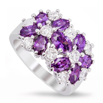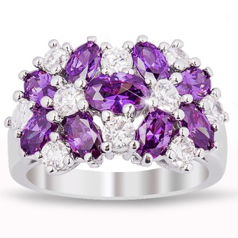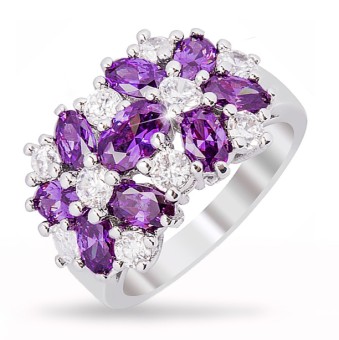 Inel fashion, placat cu aur alb de 10k, pietre semipretioase Ametist (create in laborator) si cristale stralucitoare.