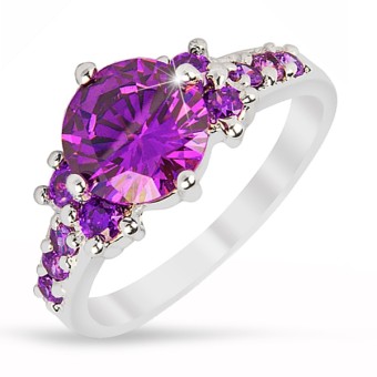 Inel fashion, placat cu aur alb de 10k, pietre semipretioase Ametist (create in laborator) si cristale stralucitoare.