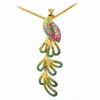 Lantisor cu pandantiv cu un design deosebit (paun), placate cu Aur galben de 14k si cristale multicolore stralucitoare.