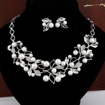 Set de bijuterii glamour pentru mireasa (colier si cercei), bijuterii pentru nunta cu un design floral incantator, placate cu cristale stralucitoare.