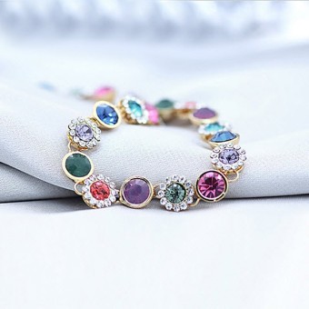 Bratara fashion cu motive florale, placata cu aur galben de 18k si cristale multicolore stralucitoare.