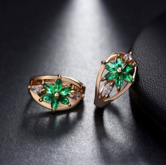 Cercei cu design floral dosebit, placati cu pietre semipretioase Zirconiu culoare Smarald si Aur galben 14k.