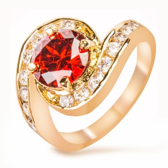 Inel fashion deosebit, placat cu aur galben 14k, pietre semipretioase Granat (create in laborator) si cristale stralucitoare.