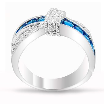 Inel fashion, placat cu aur alb de 10k, pietre pretioase Safir (create in laborator) si cristale stralucitoare.
