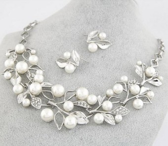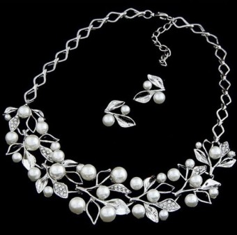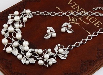 Set de bijuterii glamour pentru mireasa (colier si cercei), bijuterii pentru nunta cu un design floral incantator, placate cu cristale stralucitoare.